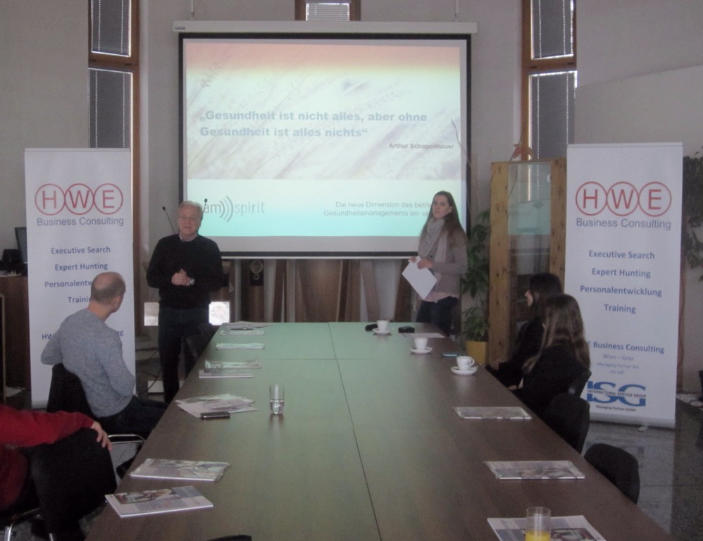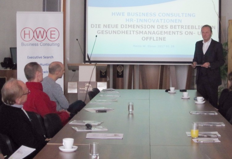 Die HWE Business Consulting veranstaltet mehrmals jährlich die Veranstaltungsreihe HWE Business Consulting HR-Innovationen. Bei diesen Veranstaltungen ermöglichen wir innovativen Unternehmen ihre Produkte oder Dienstleitungen zu präsentieren (Fotos von unerer 1. Veranstaltung der EKO Life GmbH mit Dr. Alois Kogler und Mag. Bettina Ehgartner).